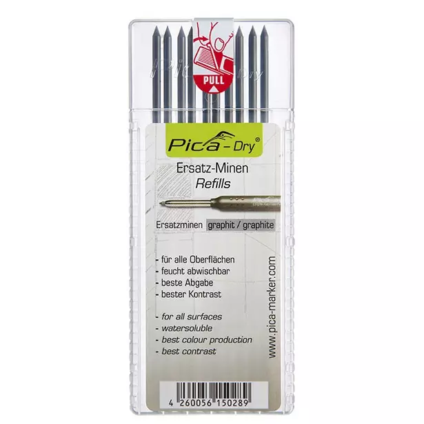 10kpl pakkaus vaihtoteriä Pica Dry -merkkauskynään. Merkkausjälki on helppo pyyhkiä kostealla rievulla tasaisilta pinnoilta. Terän pituus 125 mm ja halkaisija 2,8 mm. Toimitetaan kätevässä ja tukevassa muovikotelossa. Terät ovat valmiiksi teroitetut.