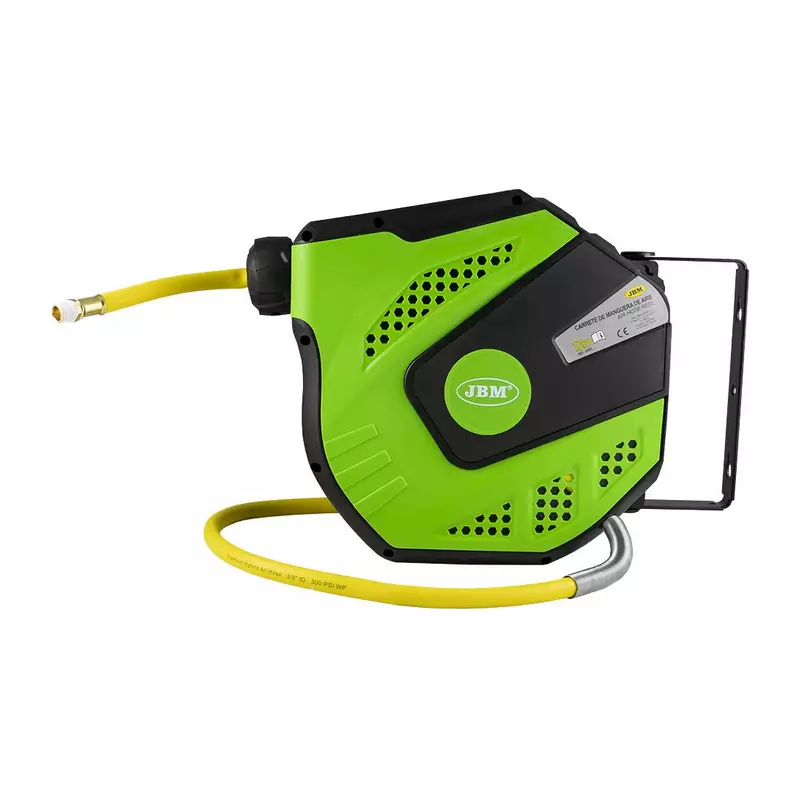Paineilmaletkukela 12m. Letkun sisähalkaisija 9.5mm. Maksimi paine 20bar/ 300psi. Automaattinen letkun ohjaus. 3/8" liittimet. Kääntyvä kiinnike seinään tai kattoon.